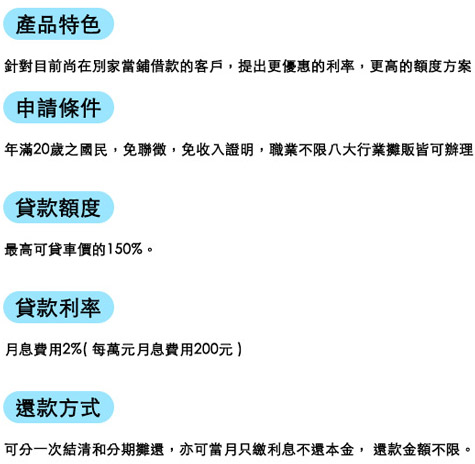 1.還款期數: 最低3-最長60期 (以月計算) 2.利息(以當舖法規定為準) : 最低1%~最高2.5%{年利率最低12%最高30%}(提早結清以日計算,無違約金)例如:借款一萬元最低月息100元最高250元。 3.無任何代辦手續費 4.依據個人工作、薪水及各項負債授信條件不同,而有所差異